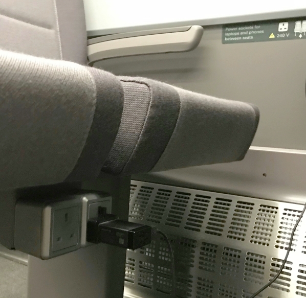 Power sockets (230v AC but not USB) for phones, tablets and laptops are provided between the seats (11), and free